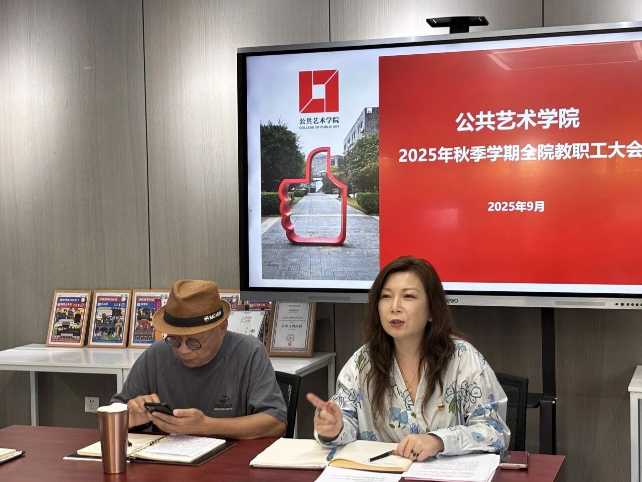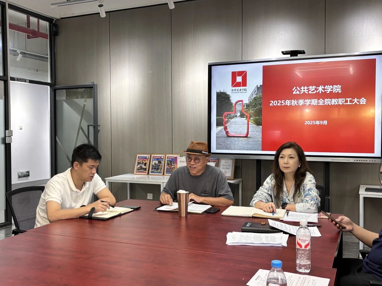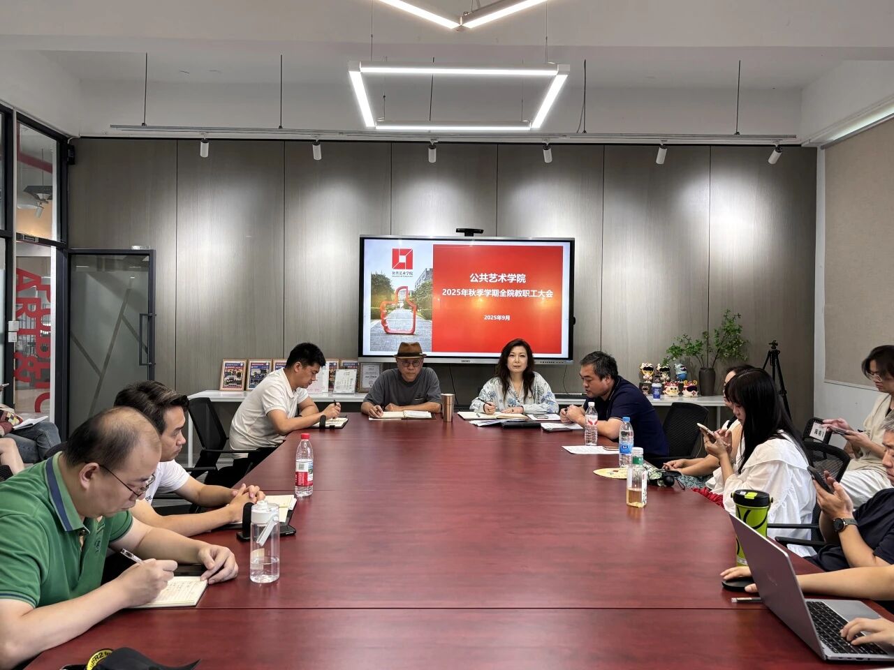 2025年9月3日上午10点,公共艺术学院召开了2025年秋季学期全院教职工大会,全面部署新学期的各项教学、科研与学生管理工作。学院领导及全体教职工出席了会议。会议由执行院长谢跃主持。