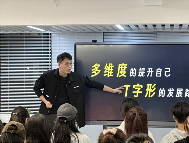 讲座伊始,主讲人就抛出了“多维度提升自己,T字形发展路径”的核心观点。他解释道:“‘T’的一竖,是你在设计领域的专业深度**,比如你是视觉设计师,就要把PS、AI、C4D等工具练到精通,把某一细分领域(如品牌设计、插画设计)做到极致;而‘T’的一横,是你的跨界广度,包括对行业趋势的洞察、跨部门协作的软技能、甚至是对商业逻辑的理解。”