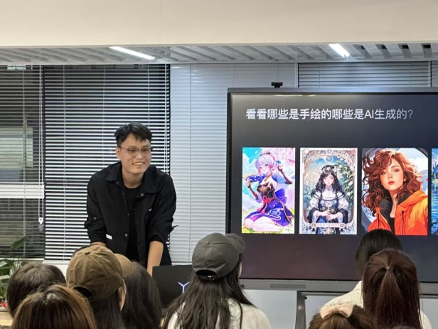 主讲人以“手绘VS AI生成”的趣味互动环节,解答了这个疑惑。他展示了几张风格各异的设计作品,让现场同学抢答“哪些是手绘,哪些是AI生成”。抢答正确的同学还获得了精美的设计周边奖品,现场气氛一度达到高潮。