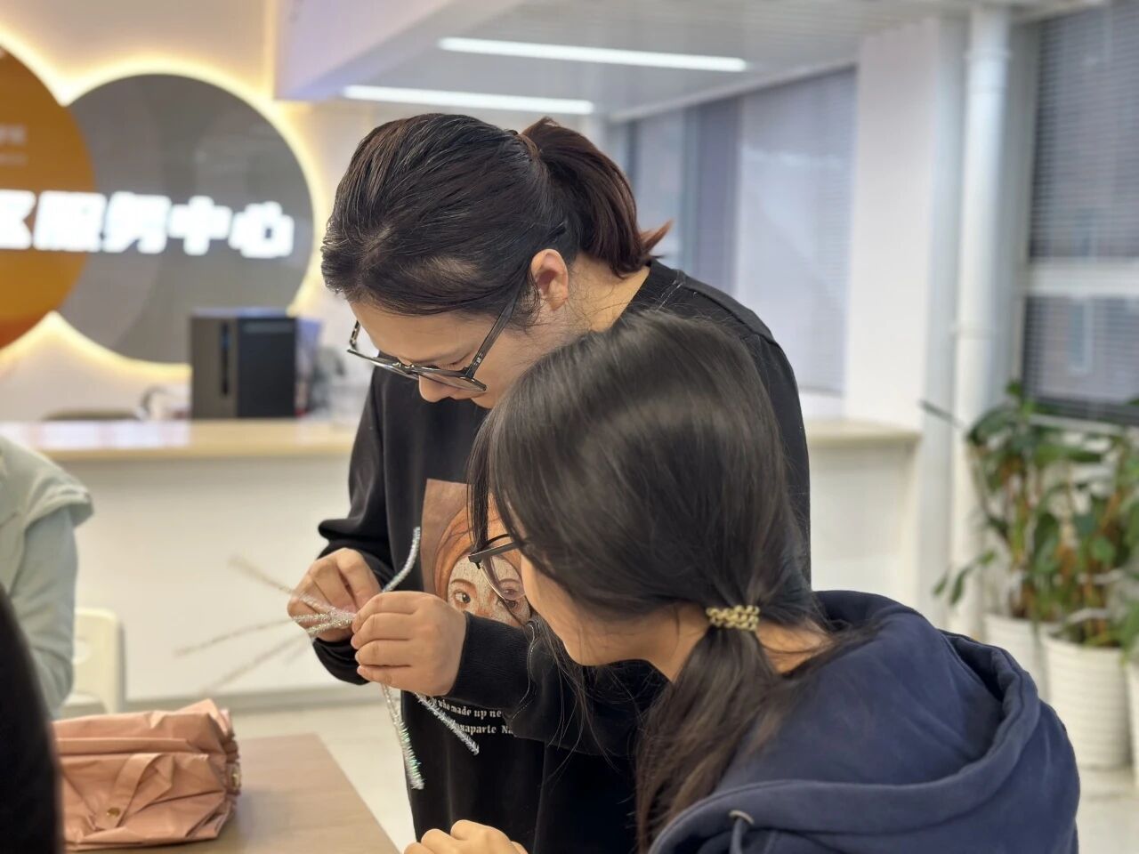 下午五点刚过,一站式学生服务中心便热闹起来。同学们带着对艺术创作的期待早早到场,老师们也笑意盈盈地加入其中。桌面上,五颜六色的扭扭棒、剪刀、胶水等工具整齐排列,仿佛在等待一场创意风暴的降临。随着活动正式开始,大家迅速投入状态。有的同学对着示例图仔细研究花瓣的造型,有的则大胆尝试配色,还有的在老师的指导下,慢慢摸索扭扭棒的缠绕技巧。现场氛围轻松而热烈,时不时传来讨论声与欢笑声,“这个粉色和紫色搭配会不会更好看?”“老师,您看我这个花瓣这样扭对吗?”每一个问题都承载着对作品的用心,每一次交流都迸发着创意的火花。