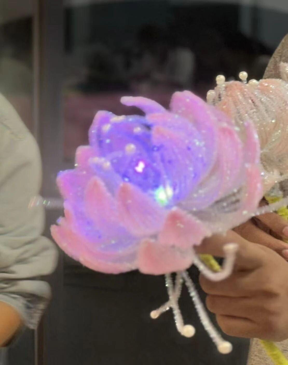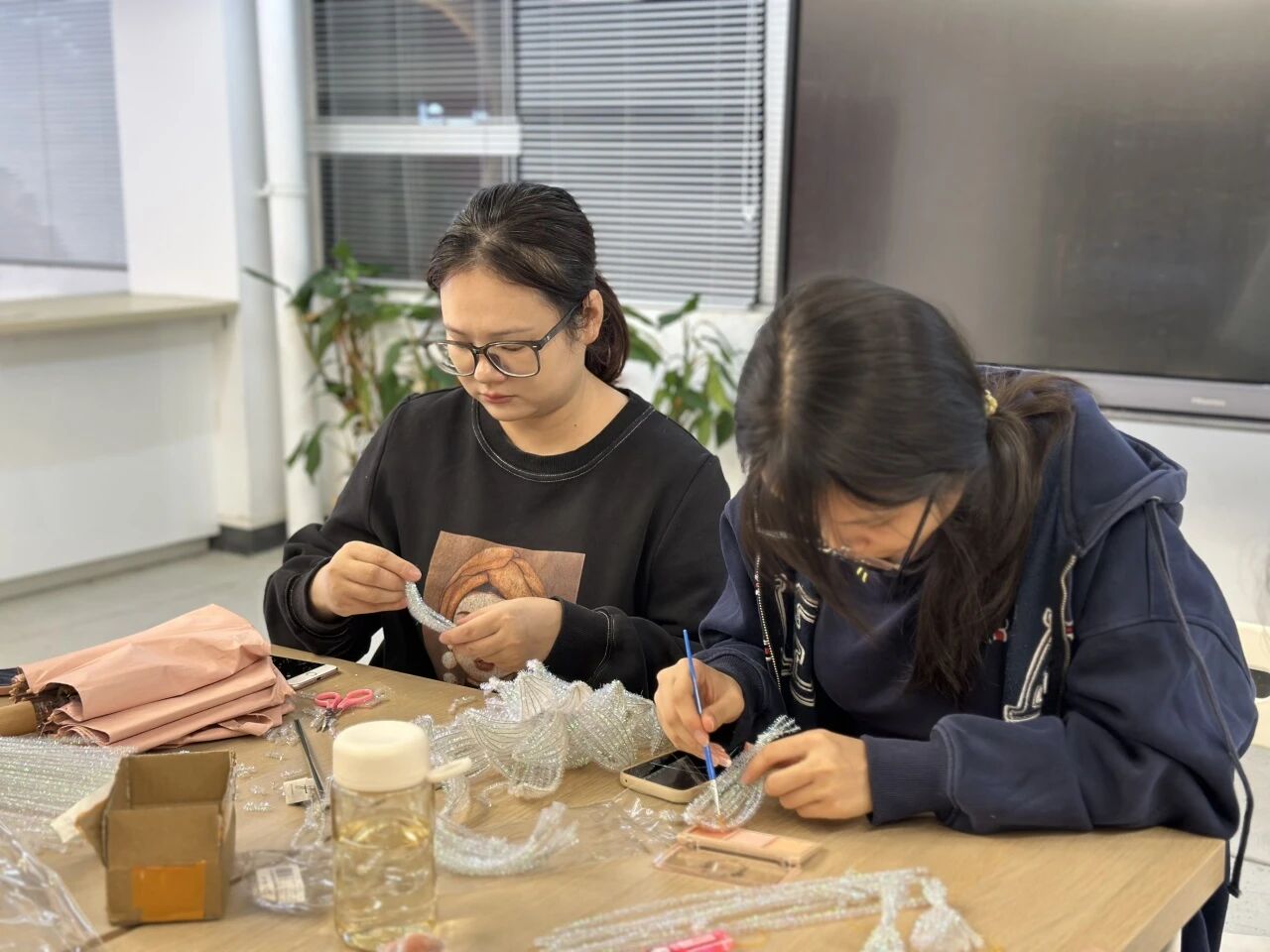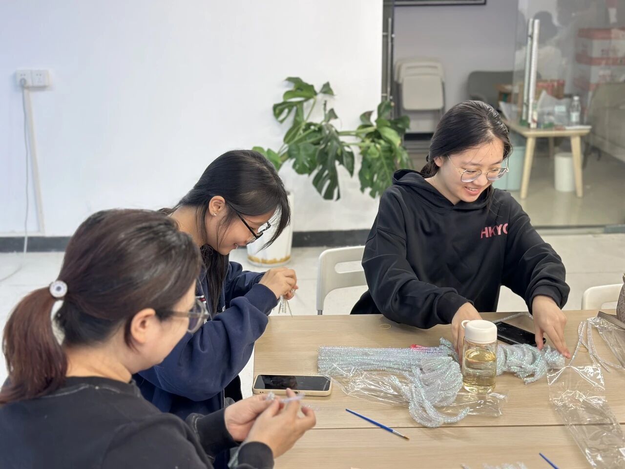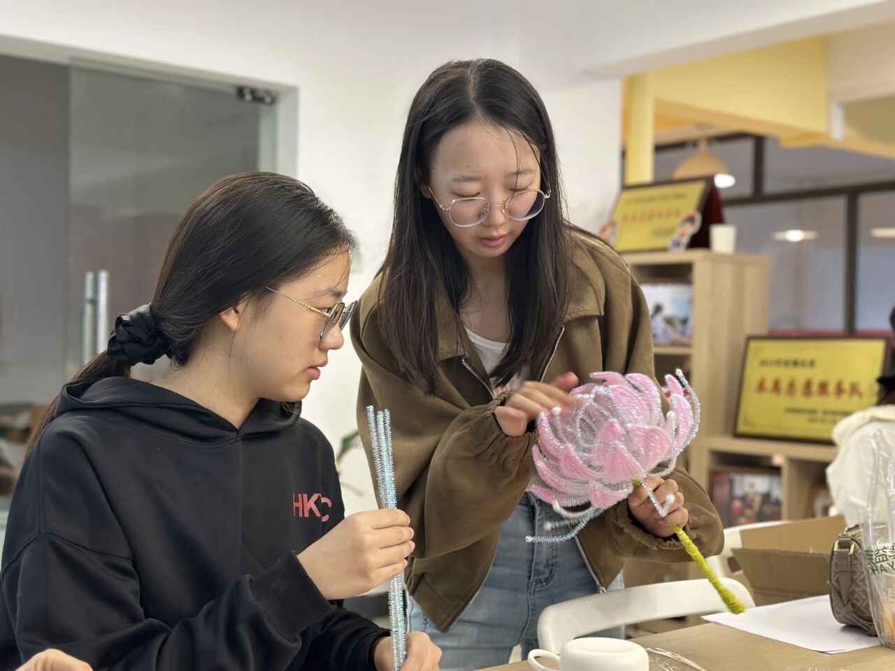 在创作过程中,扭扭棒在同学们的指尖仿佛有了生命。原本普通的彩色毛条,经过弯折、缠绕、拼接,逐渐呈现出花瓣的雏形。大二的李同学专注地调整着花瓣的弧度,“没想到扭扭棒能做出这么精致的花,每一片花瓣都要仔细拿捏,这种创作的沉浸感太治愈了!”老师们也化身“手工达人”,与同学们一同创作、交流。禾田的熊老师拿着自己制作的半成品打趣道:“和大家一起做手工,仿佛回到了学生时代,这种感觉很奇妙。”她还耐心地给旁边的同学示范如何让花瓣层次更丰富,师生间的互动充满温情。现场的作品渐渐丰富起来,有的是清新淡雅的“睡莲”,有的是绚烂夺目的“昙花”,还有的融入了LED灯元素,让手工花在灯光下更显梦幻。每一朵花都是独一无二的,承载着创作者的巧思与热情。