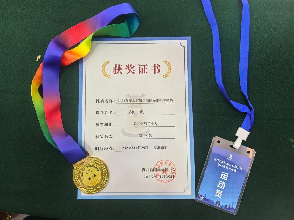 在刚刚过去的2025年湖北省第二期国际象棋等级赛上,一个熟悉的名字再次闪耀——公共艺术学院工艺美术2402班的姚想同学,勇夺最高级别公开组冠军。这不仅仅是一枚奖牌,更是他2025年丰富而精彩的一年的生动缩影。这一年,姚想以卓越的才华和持续的努力,在艺术创作、智力竞技、文化传承多个赛道并行驰骋,完美诠释了何为“多维度发展,全方位成长”。