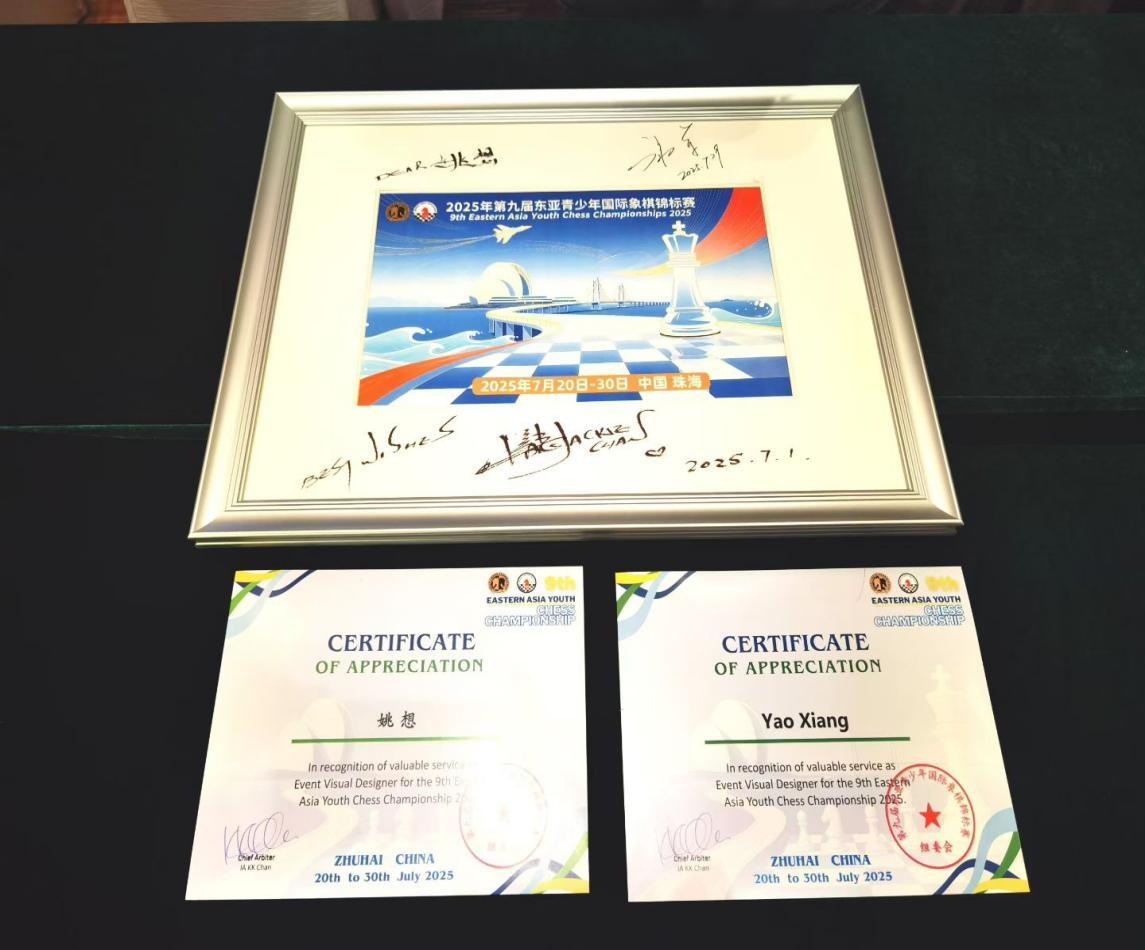 姚想的才华远不止于64格棋盘。身为工艺美术专业学子,他将艺术灵感注入智力运动。其海报设计作品《棋修远兮,一飞冲天》匠心独运,先后被第九届东亚青少年国际象棋锦标赛组委会采用,两度亮相《人民日报》,并获得国际棋联官方报道。在东亚锦标赛颁奖礼上,世界冠军、国际棋联副主席谢军亲自为他颁发作品采用证书。该作品更于年末成功入选权威的武汉设计双年展,标志着其艺术设计获得了专业领域的高度认可。