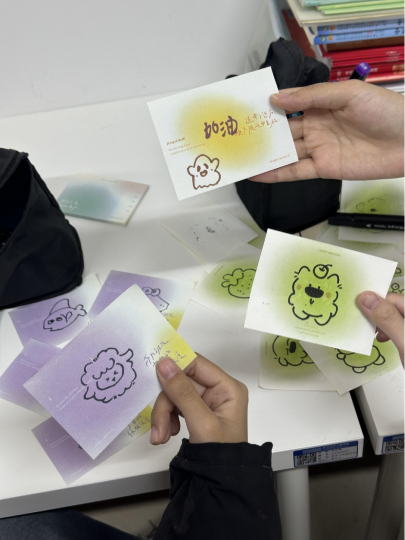 这份温柔,不止停留在此刻。「解忧调色盘」是一场没有终点的情绪疗愈,C8寝室楼进门右手边楼道的墙上,贴着活动的大海报,那抹蜿蜒的水彩色带,是我们为你留的指引;自习室的桌子上,画笔、彩纸、剪刀等工具会一直就位,无论你是清晨迎着朝阳而来,还是深夜伴着星光驻足,都能随时坐下,把当下的心情画在纸上。一张便签、一幅小画,哪怕只是几行随心的文字,都是与自己情绪的坦诚对话。你可以在画纸的角落写下无人知晓的小秘密,也可以用拼贴的方式拼凑起零碎的心情碎片,这里没有评判,没有打扰,只有一方完全属于你的创作天地。